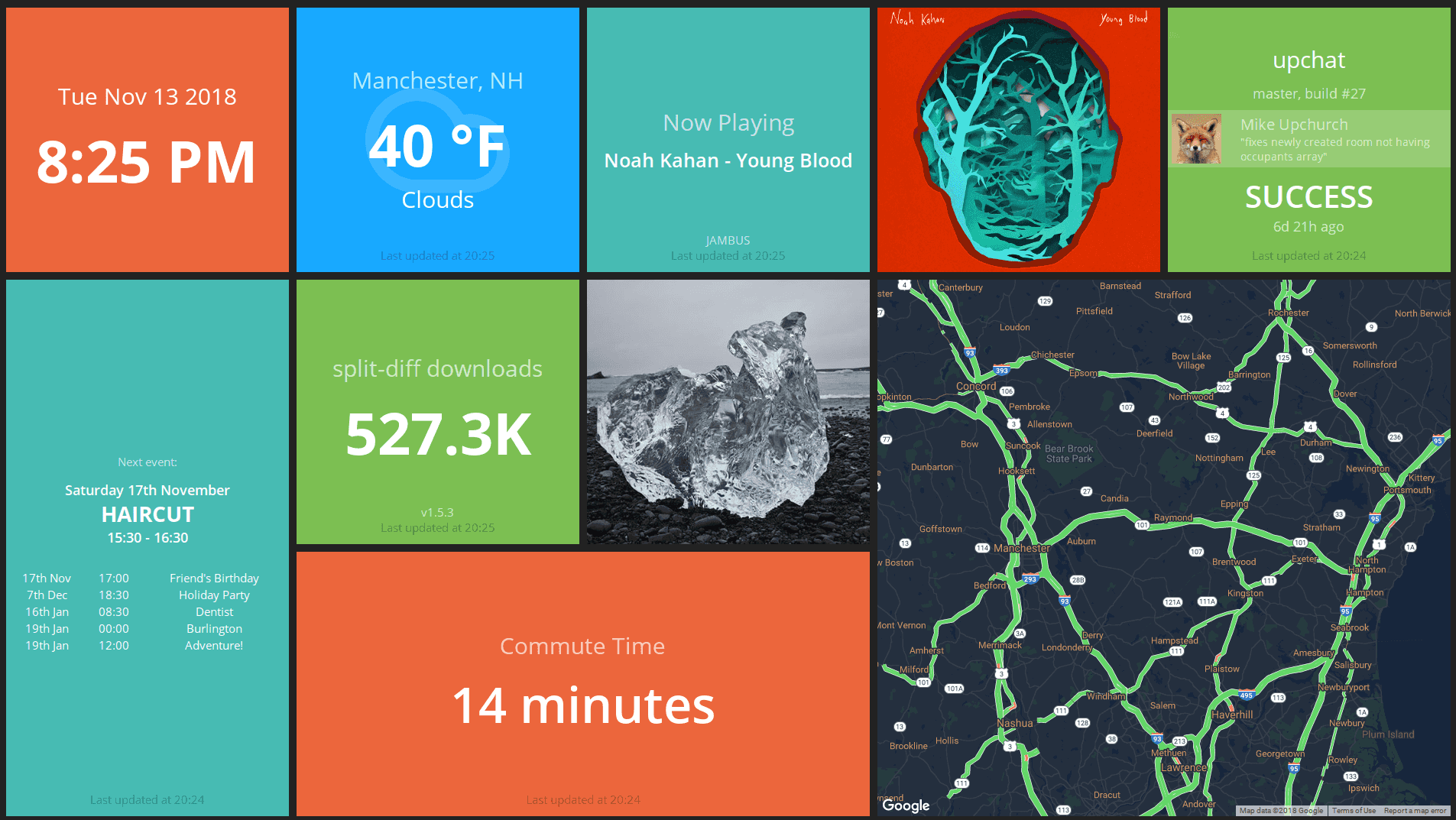 Updash is a personalized information dashboard for my home. It displays helpful things about my life such as commute time, currently playing music, weather, calendar, Instagram photos, etc.