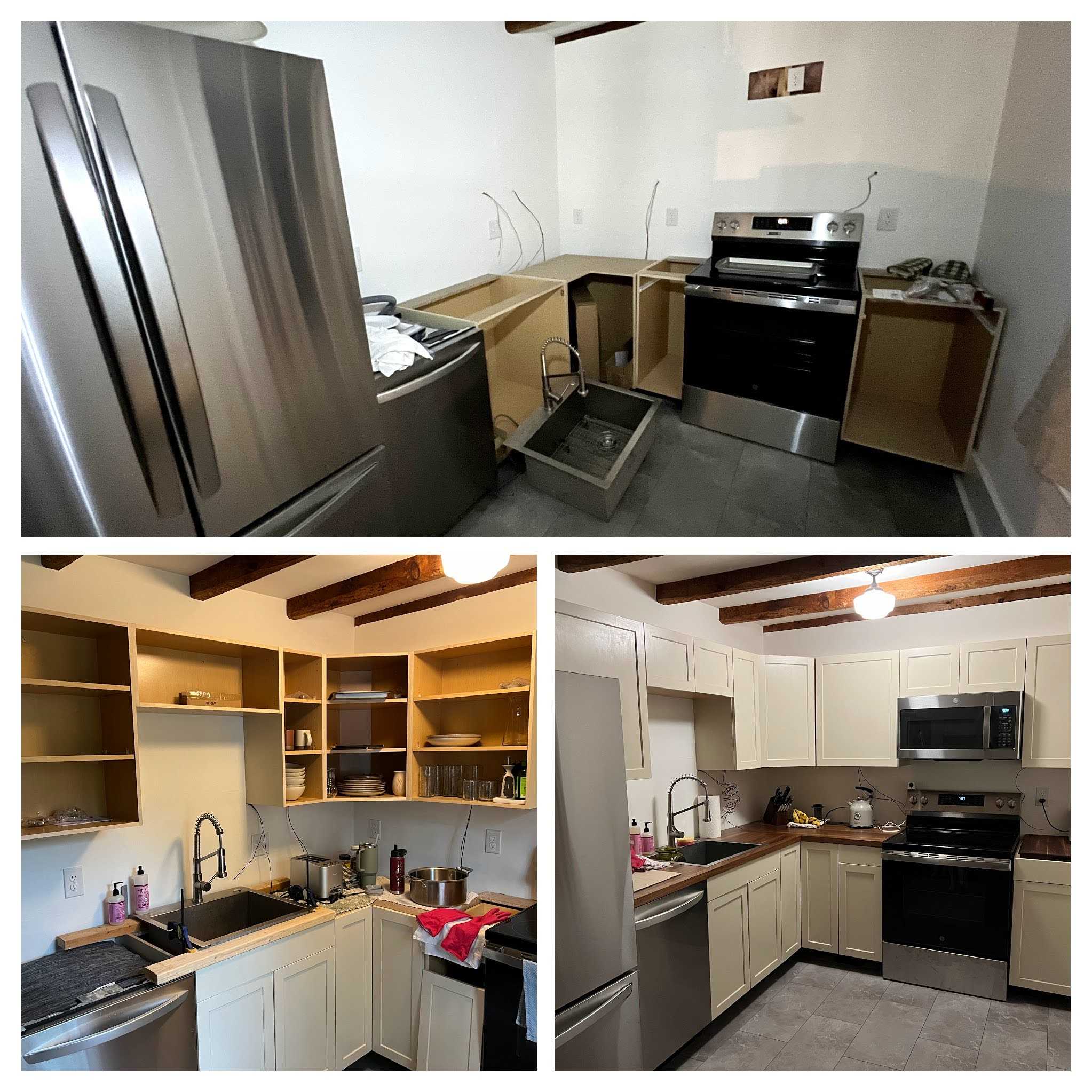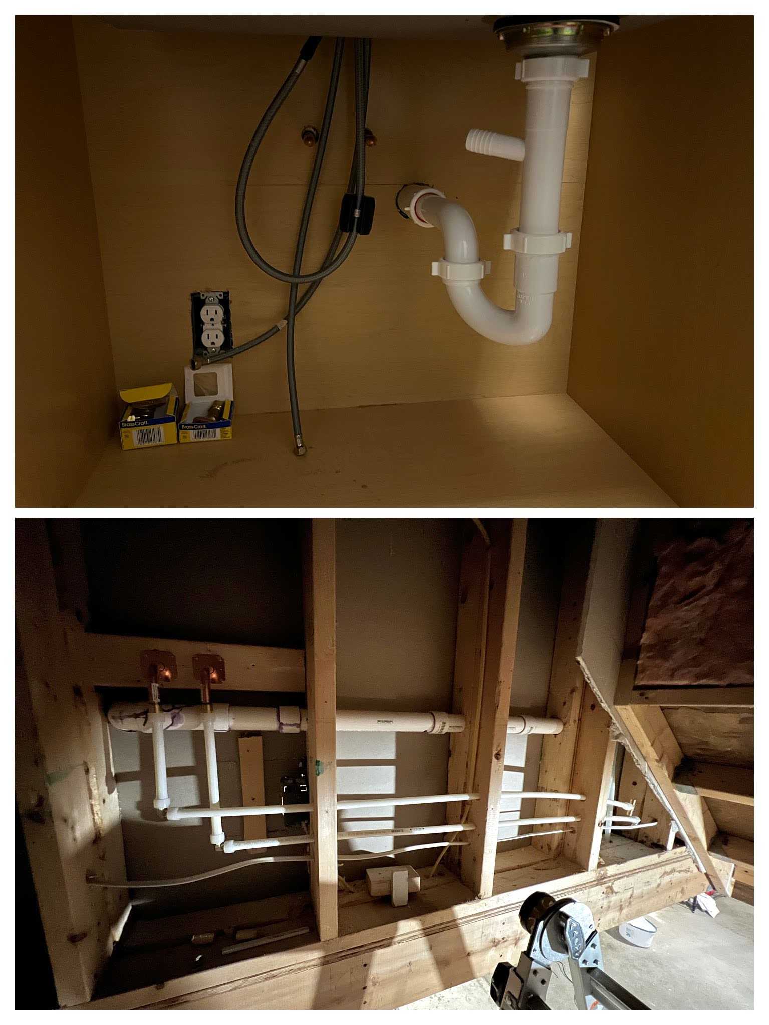 As usual, I handled the plumbing. Luckily I had full access to a wall on the backside of the kitchen. I had to move hot/cold for the sink, reroute the sink drain, and add a hookup for the fridge. For the sink drain, it is now hooked up to an existing vent I found in the wall. Previously, some remodeler had just S-trapped the drain into the floor.