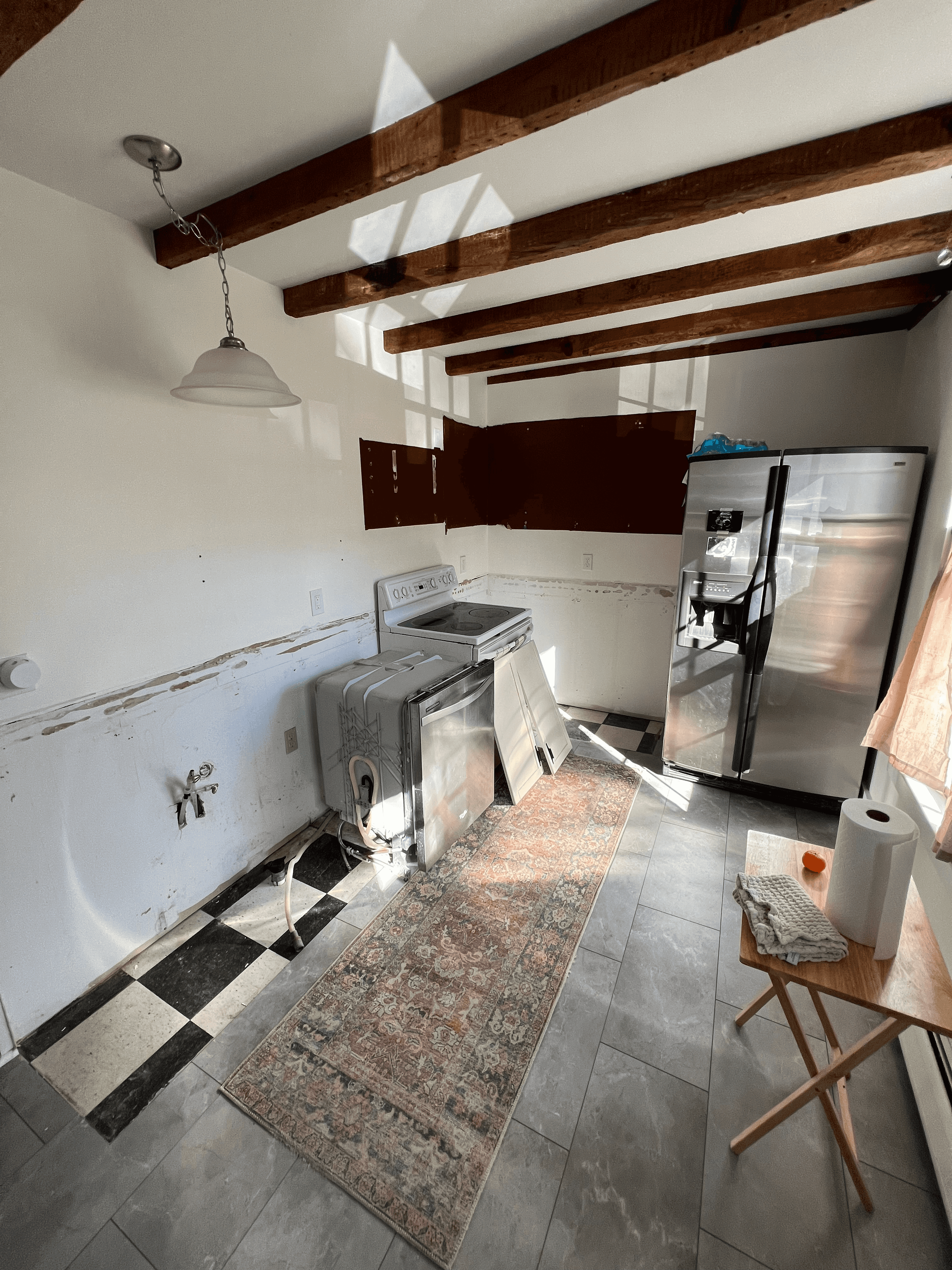 Should be straightforward, I just have to move every appliance and the kitchen sink. I started by ripping everything out. Interesting to find burgundy walls and checkerboard linoleum flooring.